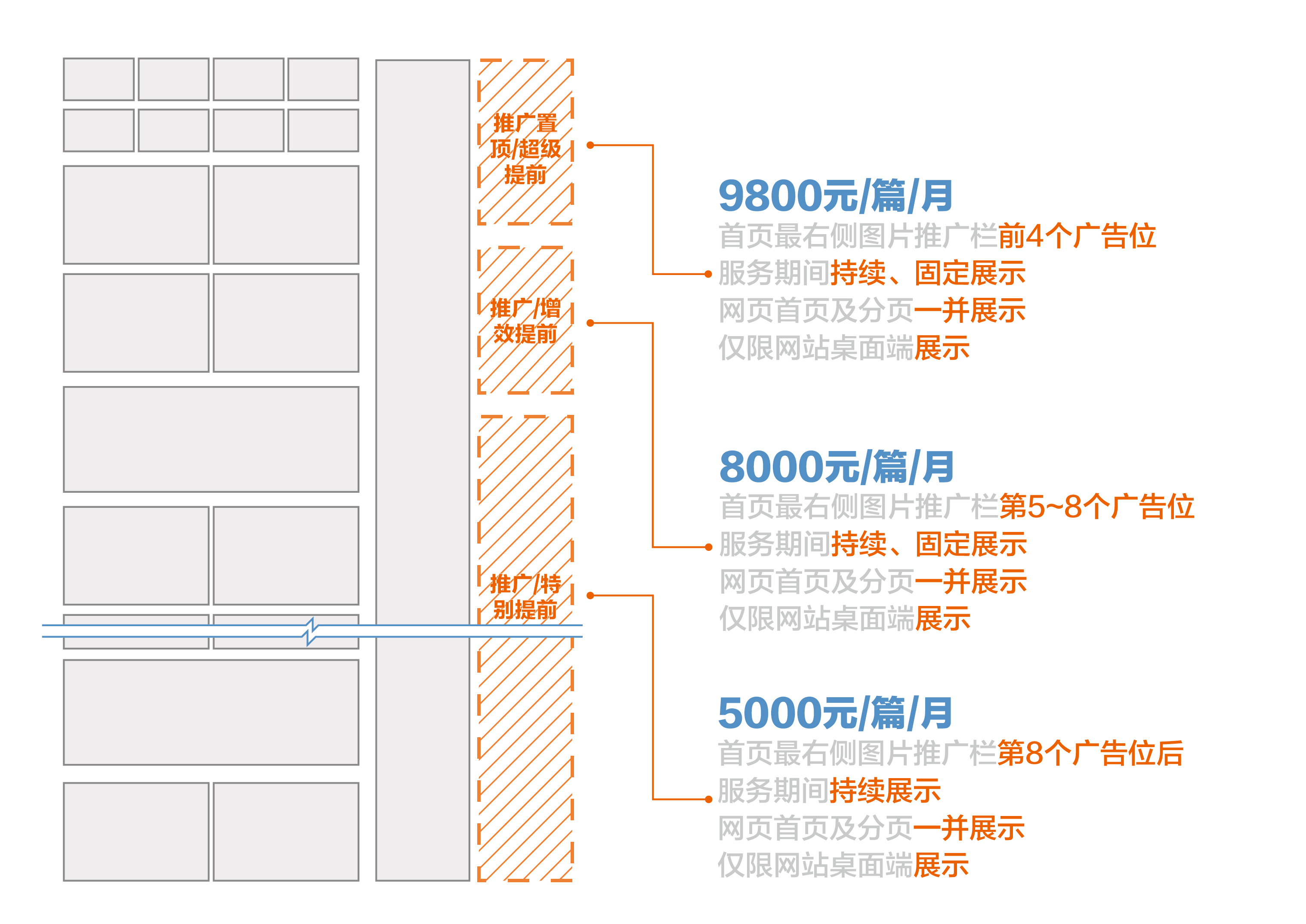 5000元/篇/月推广/招聘增效提前套餐(出现在右侧图片推广栏第8个广告位后,根据时间逐渐下沉,但服务期内仍在首页)